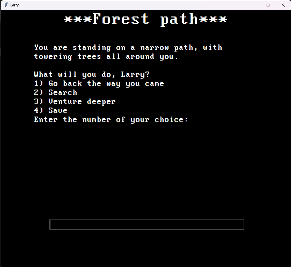 This is a retro style text based RPG, as of now it is quite short as I have been working on my Game engine (feel free to check it out: https://smugmoose.itch.io/larry-engine)